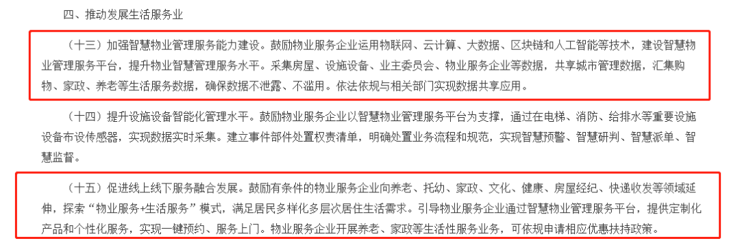其中,在推动发展生活服务业方面,《通知》还提出,鼓励物业服务企业运用物联网、云计算、大数据、区块链和人工智能等技术,建设智慧物业管理服务平台,提升物业智慧管理服务水平。鼓励有条件的物业服务企业向养老、托幼、家政、文化、健康、房屋经纪、快递收发等领域延伸,探索“物业服务+生活服务”模式,满足居民多样化多层次居住生活需求。引导物业服务企业通过智慧物业管理服务平台,提供定制化产品和个性化服务,实现一键预约、服务上门。物业服务企业开展养老、家政等生活性服务业务,可依规申请相应优惠扶持政策。 对此,易居研究院智库中心研究总监严跃进认为,此次政策最大的亮点在于对物业企业放宽经营权限,包括养老托幼、社区消费、资产管理等领域,可以认为是物业企业“春天”的到来。随着业务范围的扩大,物业企业的经营水平和服务能力将大幅提升,后续也会对存量市场的盘活产生较大的影响。原文: